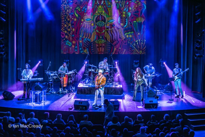 The 8-person backing band is stacked with virtuosic performers who all get their moment in the spotlight, including a 3-man percussion section of Drum Kit, Congas, and Timbale and 3-woman horn section of Saxophone, Trumpet, and Trombone.